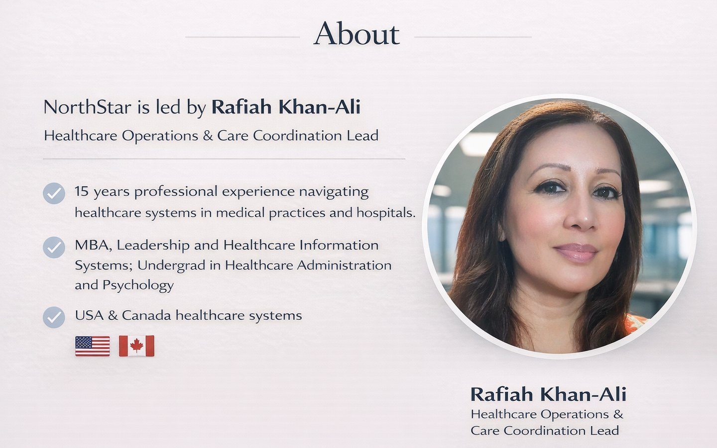 We coordinate care, manage updates, organize documents, and maintain shared dashboards so family members can stay informed regardless of location. Service is available across the U.S. and Canada.